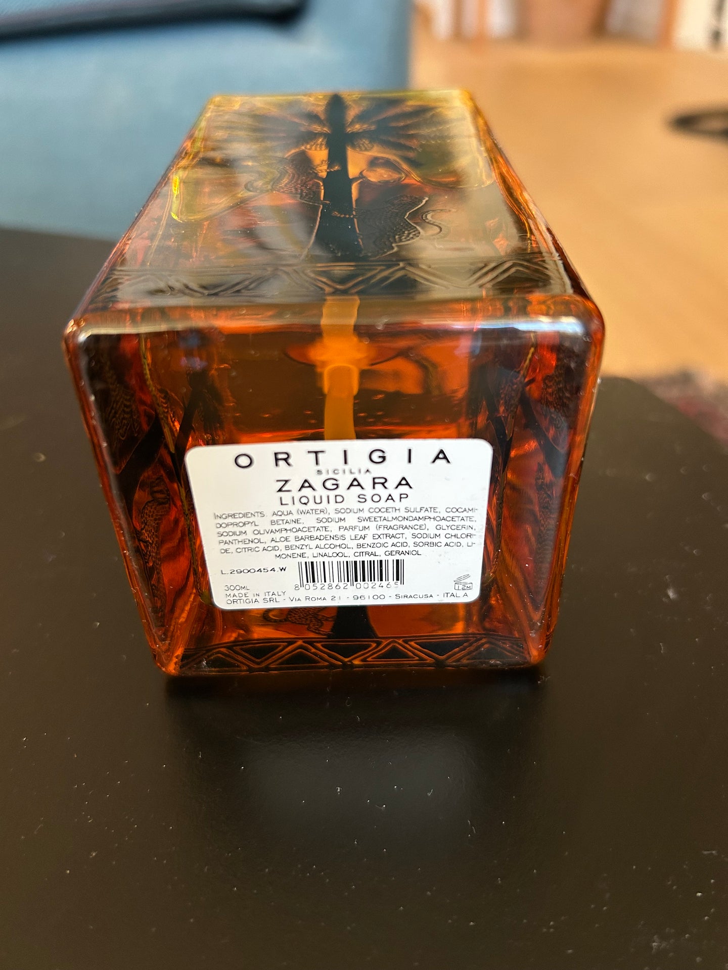 Handtvål i pumpflaska av doften Zagara/apelsin från Ortigia di Sicilia i en vacker glasflaska. Flaskan har Ortigias välkända design med palmer och leoparder som hämtat inspiration från gamla sicilianska palats av skaparen av märket, Sue Townsend. Denna kommer utan presentförpackning.