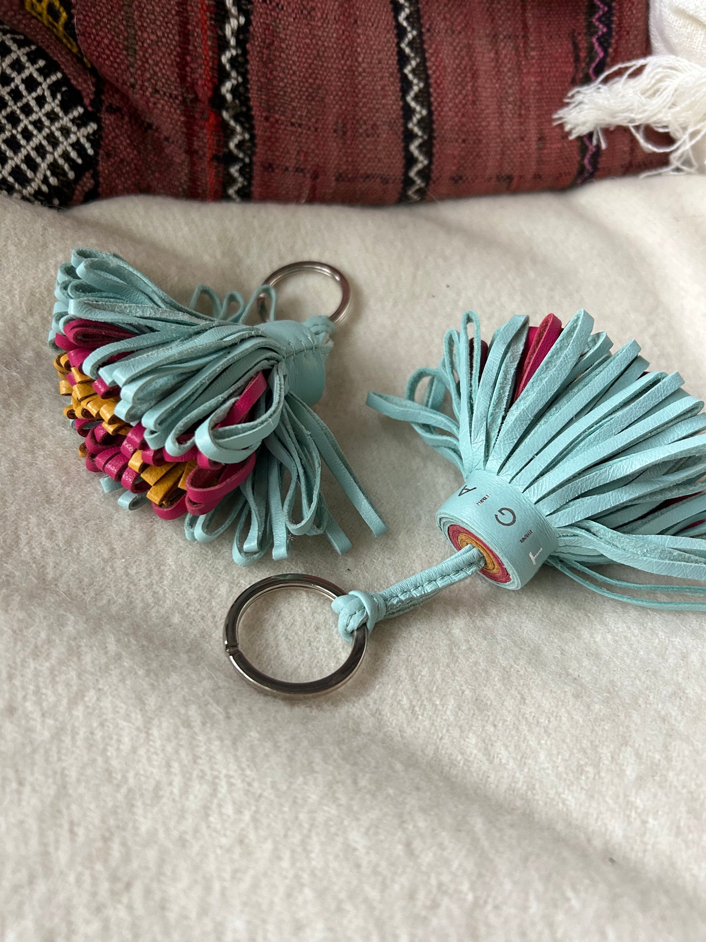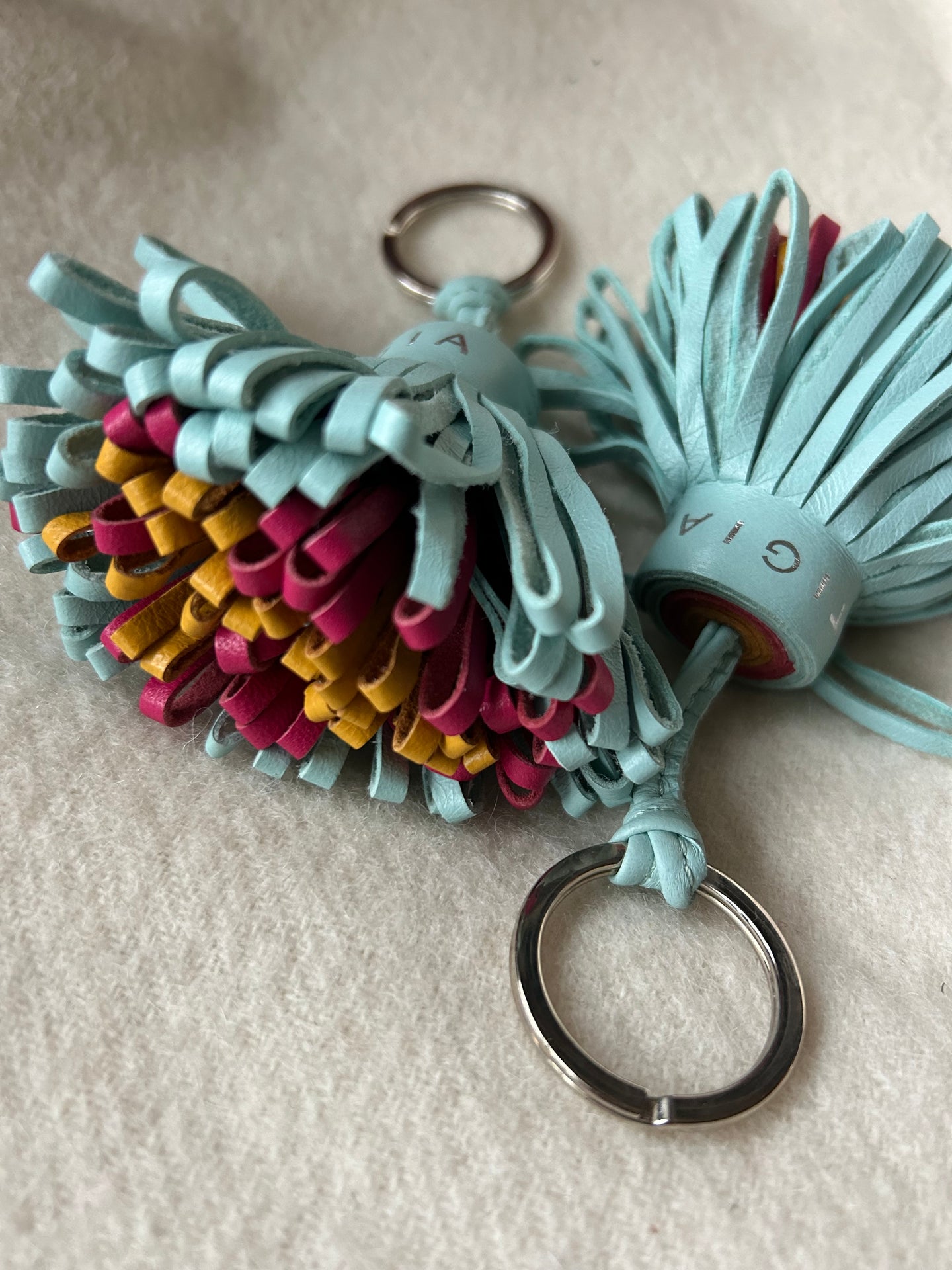 Exklusiv nyckelring i rostfritt stål med handgjord tofs av mjukt och slitstarkt nappaläder. Tofsen till Celeste har ett ljusblått ytterhölje och ett inre i cerise och gult.